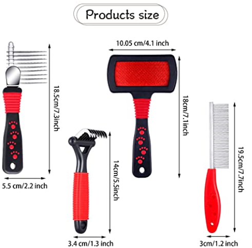 Appropriate size: the dog dematting comb with long steel safety blades measures 18.5 x 5.5 cm/ 7.3 x 2.2 inch, the pet slicker brush measures 18 x 10.5 cm/ 7.1 x 4.1 inch, the dog steel comb measures 19.5 x 3 cm/ 7.7 x 1.2 inch, and the bend pet undercoat rake comb measures 14 x 3.4 cm/ 5.5 x 1.3 inch, which are suitable for you to use and easy for you to carry.