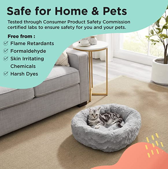 Supports better sleep:Thanks to its round shape our high-quality donut cuddler cat and dog bed is ideal for pets who love to curl up. The raised rim creates a sense of security and provides head and neck support while the super-soft filling offers joint and muscle pain relief.