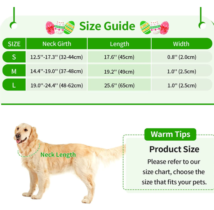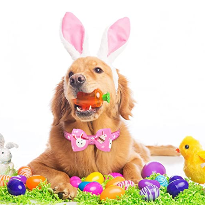Easter Dog Collars: Cute dog collars with bow are designed with Easter classic elements eggs, bunny, rabbits, carrots etc patterns and combined with bright colors, perfectly set off the Easter festival atmosphere, and make your dog stand out at the festival.