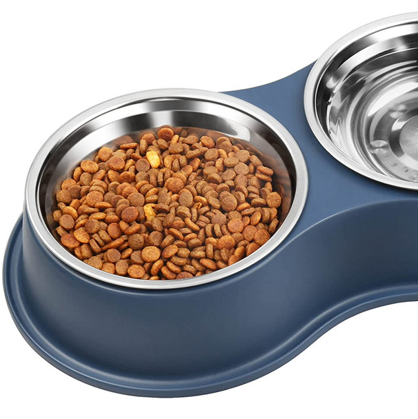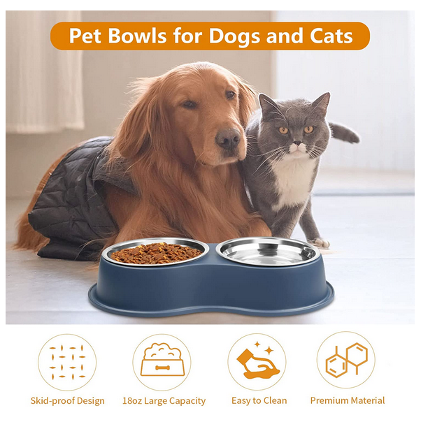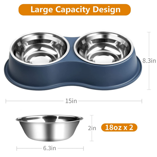 Double Dog Bowl Set: The double dog bowl set contains two 18oz stainless steel bowls and a heightening base. Provides food and water for medium dogs and cats. Dual bowls also allow you to feed multiple pets at the same time.