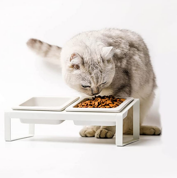 Comfortable eating: 2.75 inches height of the stand, with a 15° tilt to protect the cat's spine. The 5.3-inch bowl caliber does not touch the whiskers and is more friendly to big-faced cats.