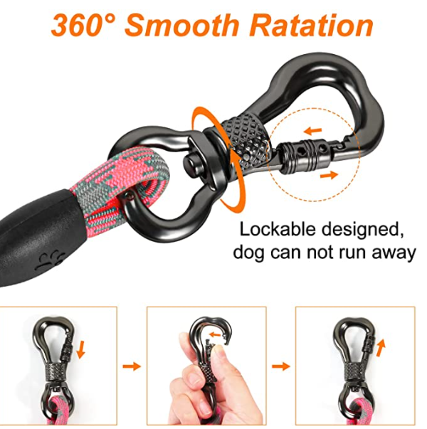 Upgraded Lockable Hook: Leash for medium dogs design 360°swivel and locked clasp with high grade zinc alloy, ultra strong and lightweight,to make sure that the clasp of the rope leash is secure and will not open unexpectedly, and allows 360°rotate at any time, your dogs will be able to move happily and safely around you without getting all tangled up.