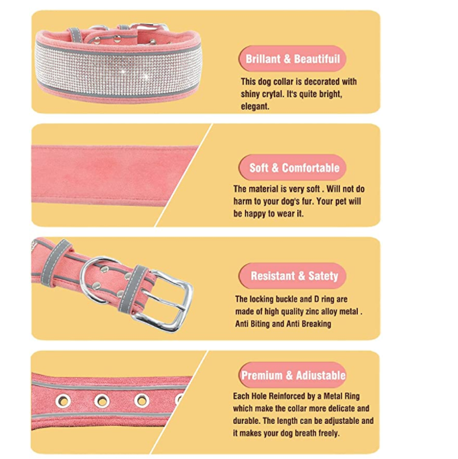 Safety and Comfortable: This dog collar come with two bright reflective stripe. With this collar, your dogs are easy to be seen at night and it can keep your dogs safer. Also, the soft dog collar is made of soft suede. It's quite comfortable. Your pet will be happy to wear it. It's a safe, comfortable dog collar.
