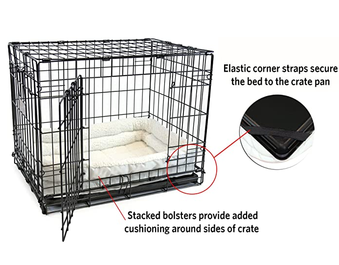 Pet bed designed for metal dog crates: double bolster unrolls to provide comfortable bumper around perimeter of your dog crate.