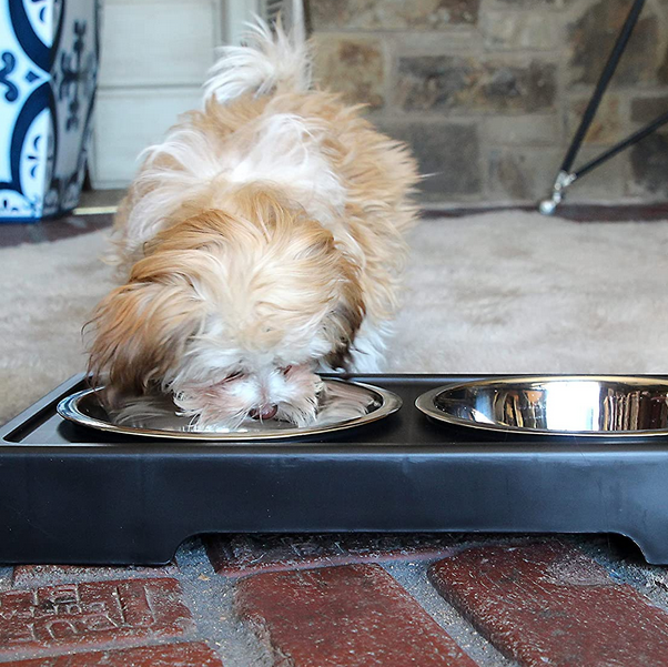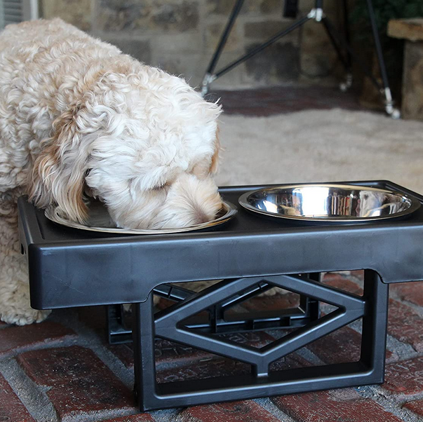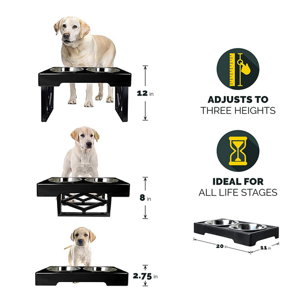 Our raised dog bowls and dog bowl stand adjust to 12" elevated dog bowls for large dogs, 8" elevated dog bowls medium sized dogs & 2.75" small dog bowls.