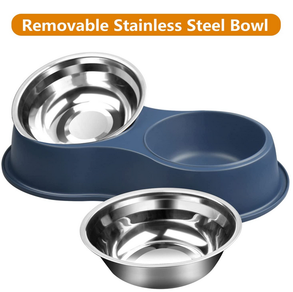 Double Dog Bowl Set: The double dog bowl set contains two 18oz stainless steel bowls and a heightening base. Provides food and water for medium dogs and cats. Dual bowls also allow you to feed multiple pets at the same time.